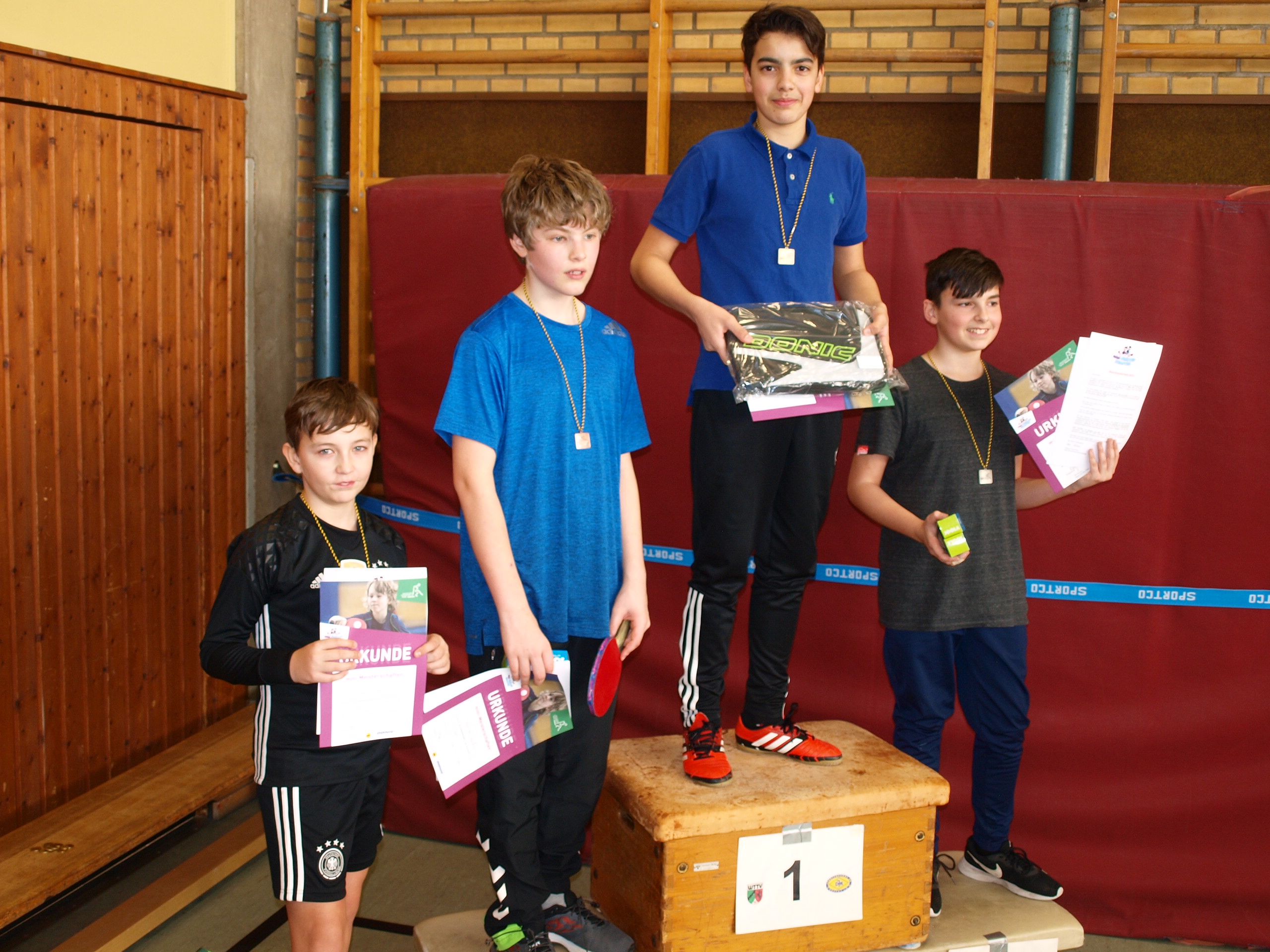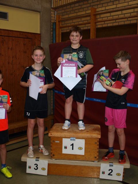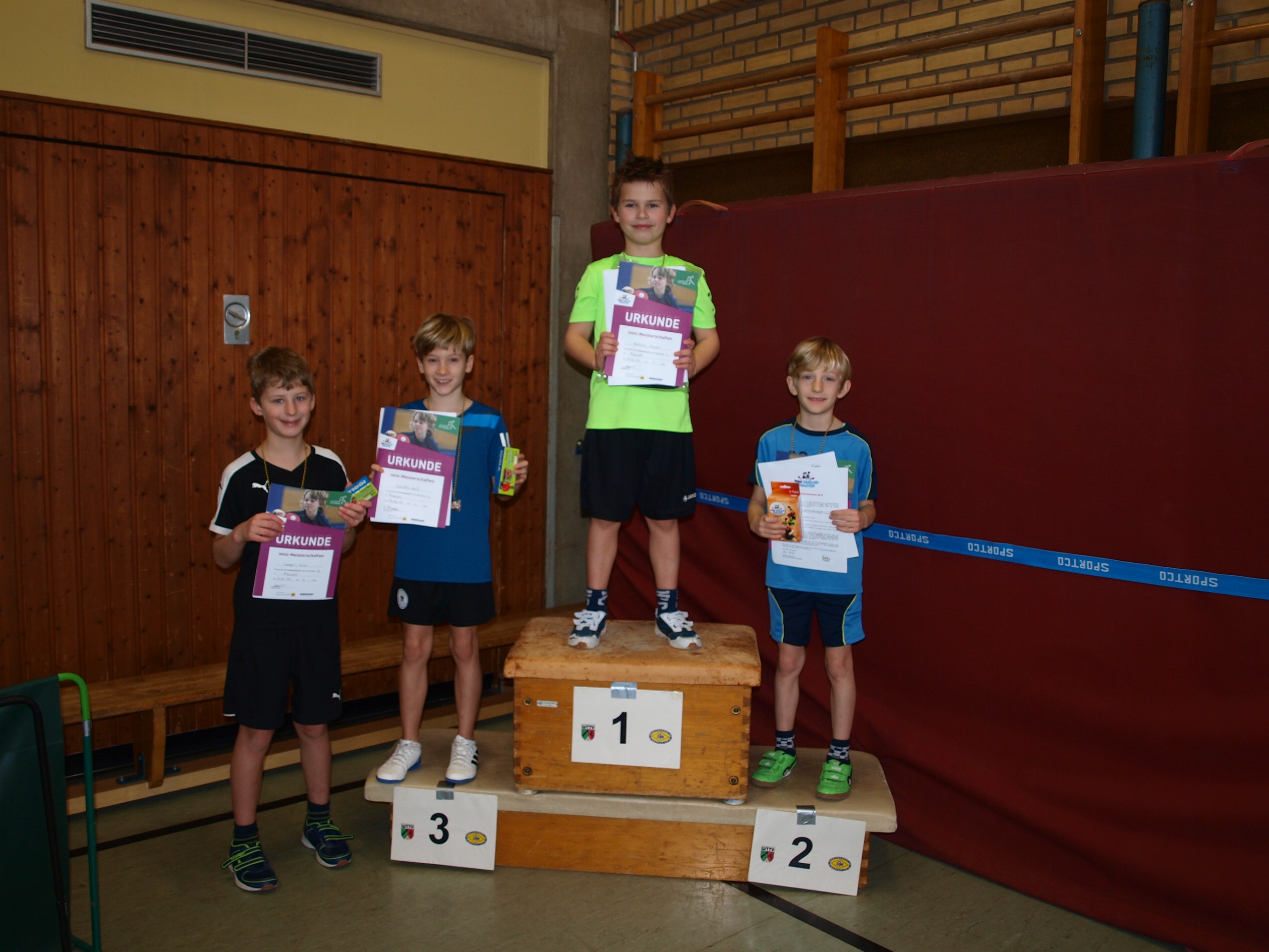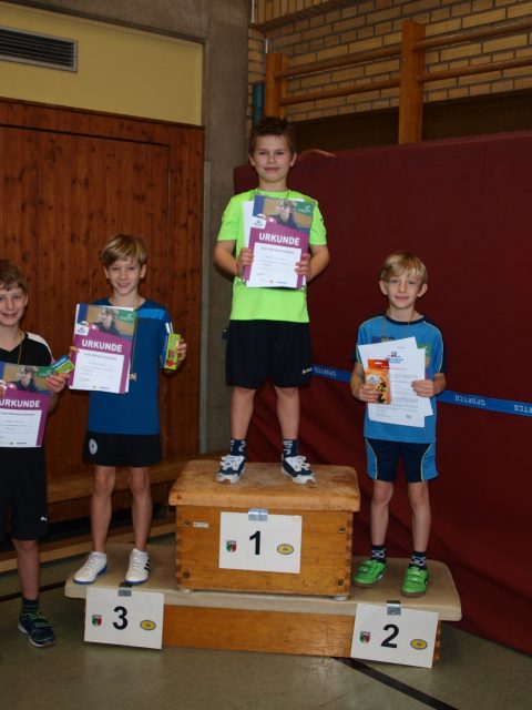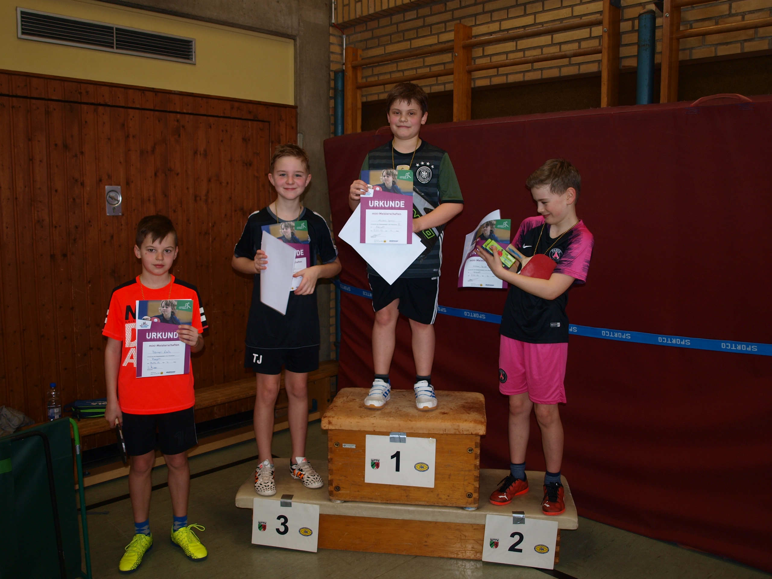Bei den Jungen (acht Jahre und jünger) hatten sich vier Kinder angemeldet und um vier Plätze für Düsseldorf gespielt – hier ging es vorrangig um eine gute Setzung beim Bezirksturnier. Steven Rettler war vor Jonathan Kollas, Henri Schmitz und Janik Langer erfolgreich. Deutlich umkämpfter waren die Fahrkarten nach Düsseldorf bei den Älteren. Mit 16 Teilnehmern die stärkste Gruppe gab es bei den 9/10-Jahre alten Jungen. Hier musste richtig gekämpft werden, um eine Runde weiterzukommen. Jannis Michels kürte sich zum Sieger. Er gewann das Finale gegen Jacob Zilkens. Rang drei ging an Nick Jennessen, der sich gegen Louis Bönnen durchsetzte. Einen souveränen Start-Ziel-Sieg legte bei den älteren Jungen (11/12 Jahre) Hussein Abasguliyev hin. Ohne Satzverlust sicherte er sich Rang 1 vor Max Gold, Alexander Bomfleur und Tyler Scharold.