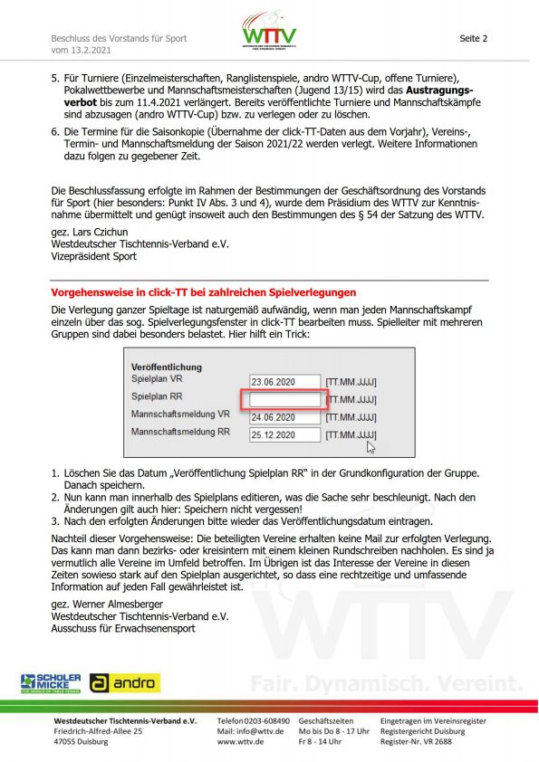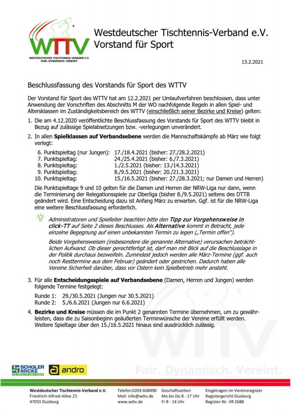 Der Vorstand für Sport des WTTV hat am 12.2.2021 per Umlaufverfahren beschlossen, dass unter Anwendung der Vorschriften des Abschnitts M der WO nachfolgende Regeln in allen Spiel- und Altersklassen im Zuständigkeitsbereich des WTTV (einschließlich seiner Bezirke und Kreise) gelten: