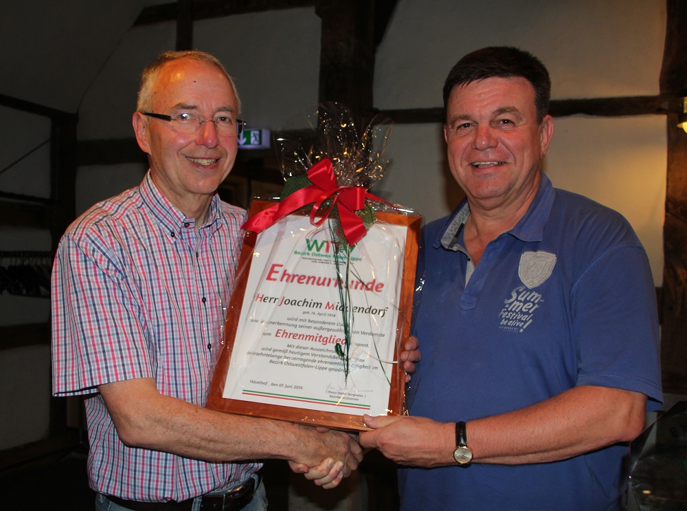 Zum Ehrenmitglied wurde der scheidende Bezirksjugendwart Joachim Middendorf (VfL Oldentrup) in Anerkennung seiner außergewöhnlichen Verdienste ernannt. Damit verlässt einer der profiliertesten Bezirksfunktionäre die „Kommandobrücke“, so Klaus-Dieter Borgmeier in seiner Laudatio.  Aufgrund seines großen Fachwissens wurde seine Meinung nicht nur auf Kreis- und Bezirksebene sondern auch auf WTTV-Ebene sehr geschätzt. Für viele auch ein wertvoller Ratgeber, gerade auch bei brisanten Themen. Mit dieser Auszeichnung wurde eine jahrzehntelange hervorragende ehrenamtliche Tätigkeit im Bezirk Ostwestfalen-Lippe gewürdigt. Er war von 1983-2005 Sachbearbeiter für Jungensport, 2005-2013 Bezirksjugendsportwart  und von 2013 bis zu seinem Ausscheiden 2019 Bezirksjugendwart.