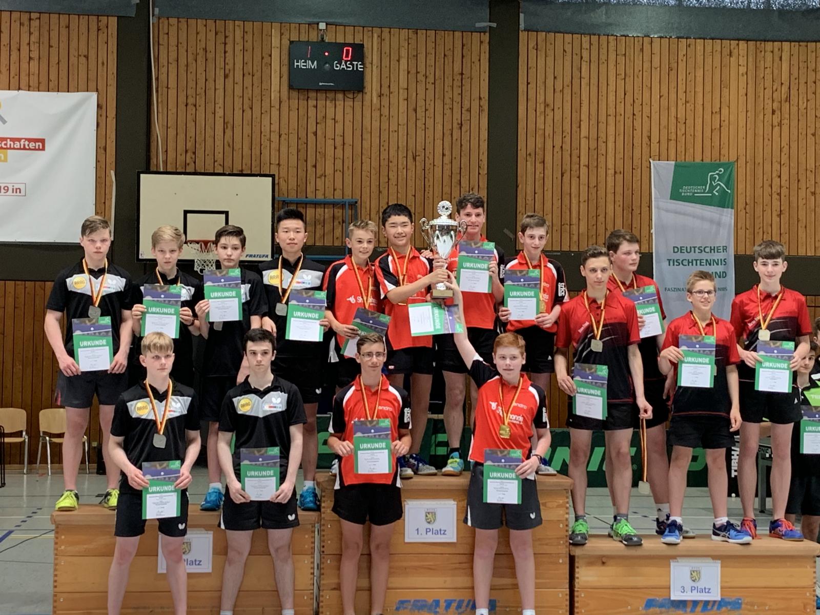 Unsere Schüler erspielten sich am ersten Tag die Gruppenführung mit 6:0 Punkten und hatten beste Chancen, ihren Titel vom letzten Jahr zu verteidigen. Am zweiten Tag des großen Turniers erreichten die Schüler im Halbfinale gegen den TSG Sulzbach 1888 durch ein 6:3 die Endrunde der Deutschen Mannschaftsmeisterschaften. Im Finale traten die Schüler gegen den TSV Bad Königshofen e.V. an und trotz sehr spannender Duelle und knapp verlorener Spiele reichte es nur zum 2:6. Leider konnten die Schüler ihren Titel aus dem letzten Jahr nicht verteidigen, durften sich aber über einen wohlverdienten 2. Platz freuen.