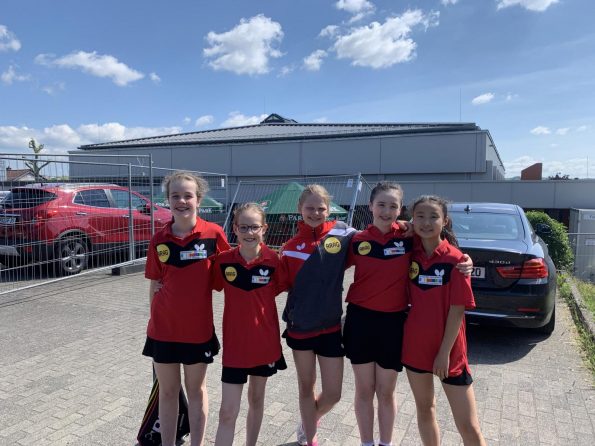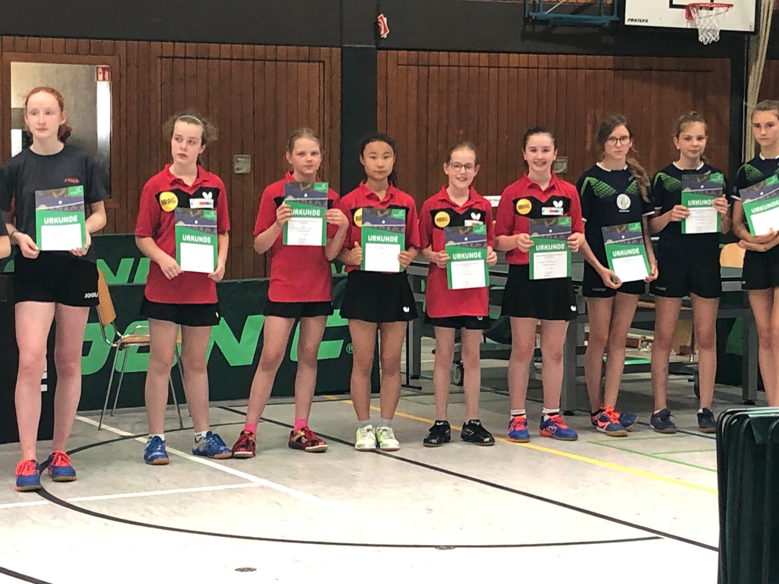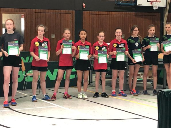Die Mannschaft der Schülerinnen um Eireen Kalaitzidou, Philippa von Bandemer, Lani Jandt, Aoi Osawa und Helene Hanke traten an diesem Wochenende zusammen das erste mal bei einem großen nationalen Turnier im Mannschaftswettbewerb an. Die äußerst junge Schülerinnenmannschaft, die überraschenderweise Westdeutschen Mannschaftsmeisterinnen geworden sind, konnte ohne Druck frei aufschlagen. In der Gruppenphase an vier gesetzt, konnten sich die Schülerinnen durch ein starkes 6:1 gegen den VfL Duttweiler doch noch den 3. Platz erkämpfen. In der Zwischenrunde erreichten die Mädchen das Spiel um Platz 5 durch ein souveränes 6:2 gegen SV Helfendorf e.V. Im letzten Spiel mussten sie dann leider dem späteren fünfplatzierten Post SV Mühlhausen nach einem stark umkämpften 5:5, 19:19 Sätzen, aber leider einer Differenz von nur 8 Bällen gratulieren.