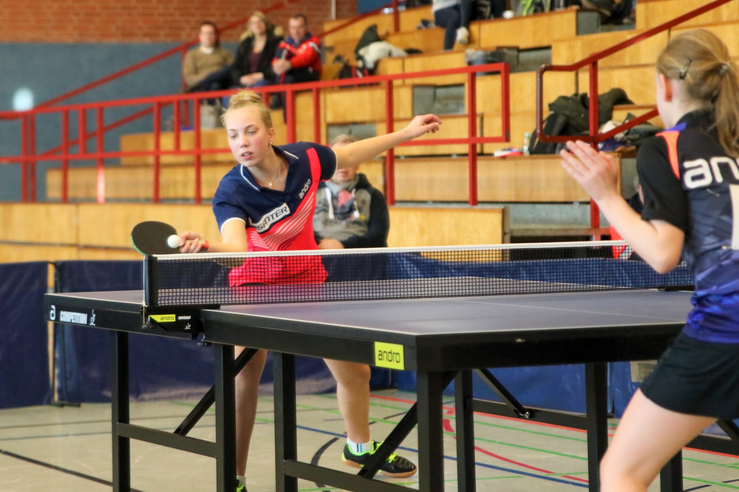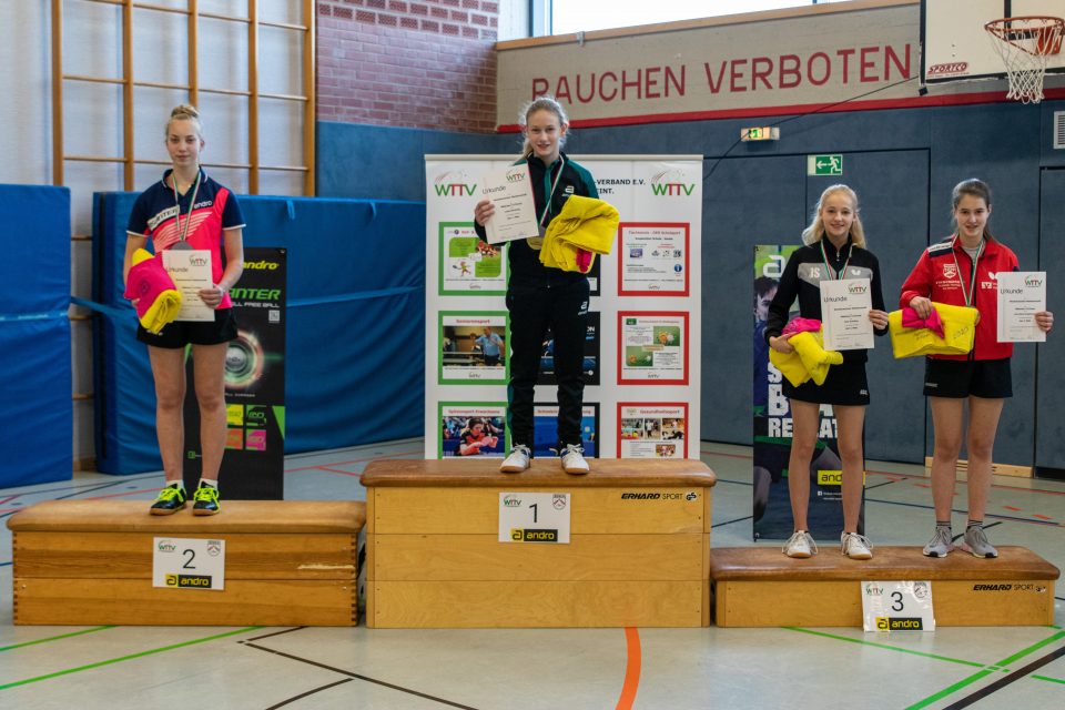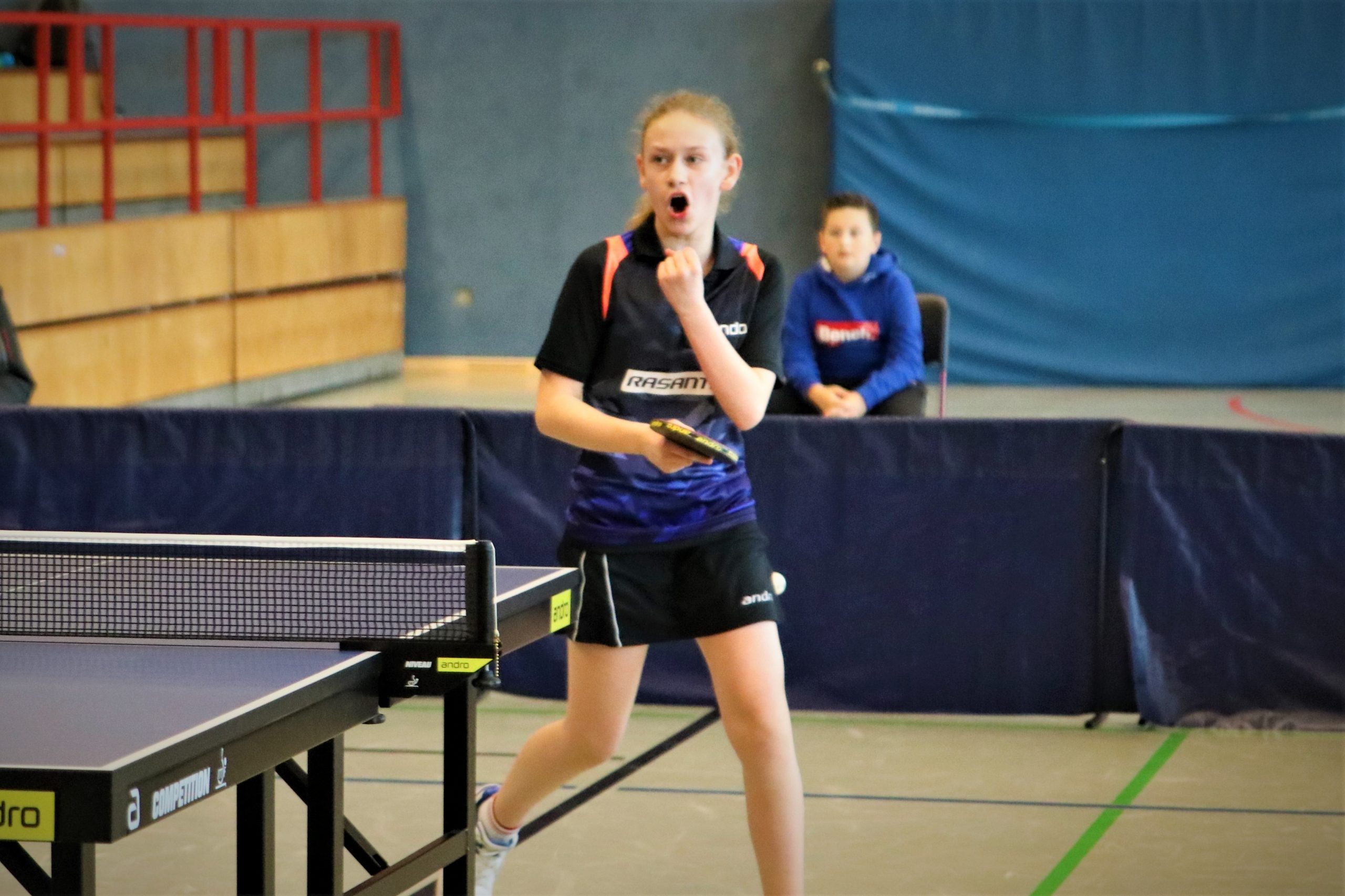 In der Mädchen-Konkurrenz gab es keine großen Überraschungen. Lediglich, dass Jana Schultza im Viertelfinale gegen ihre Doppel- und Vereinskameradin Medeea Grozav-Marcu gewann, hätte vielleicht nicht jeder in der Halle voraus gesagt. So kam es dann auch zum Finale der beiden topgesetzten Melinda Maiwald, die im Achtel- und Viertelfinale über die volle Distanz gehen musste, und Luisa Düchting, die sich im Halbfinale sehr knapp nach einem 1:2-Satzrückstand gegen Lina-Marie Engelmann (SV Bergheim) durchsetzte. In einem sehr knappen Finale fand zuerst Melinda besser ins Spiel und sicherte sich Satz eins mit 11:6. Doch dann riss etwas der Faden, Luisa wurde mutiger und holte sich Satz zwei und drei relativ deutlich. Nachdem Melinda zum 2:2 ausgleichen konnte, war der Entscheidungssatz völlig ausgeglichen. Am Ende hatte Luisa mit 13:11 hauchdünn die Nase vorne und holte sich nach dem Ranglistensieg nun auch den Titel bei den Einzelmeisterschaften.