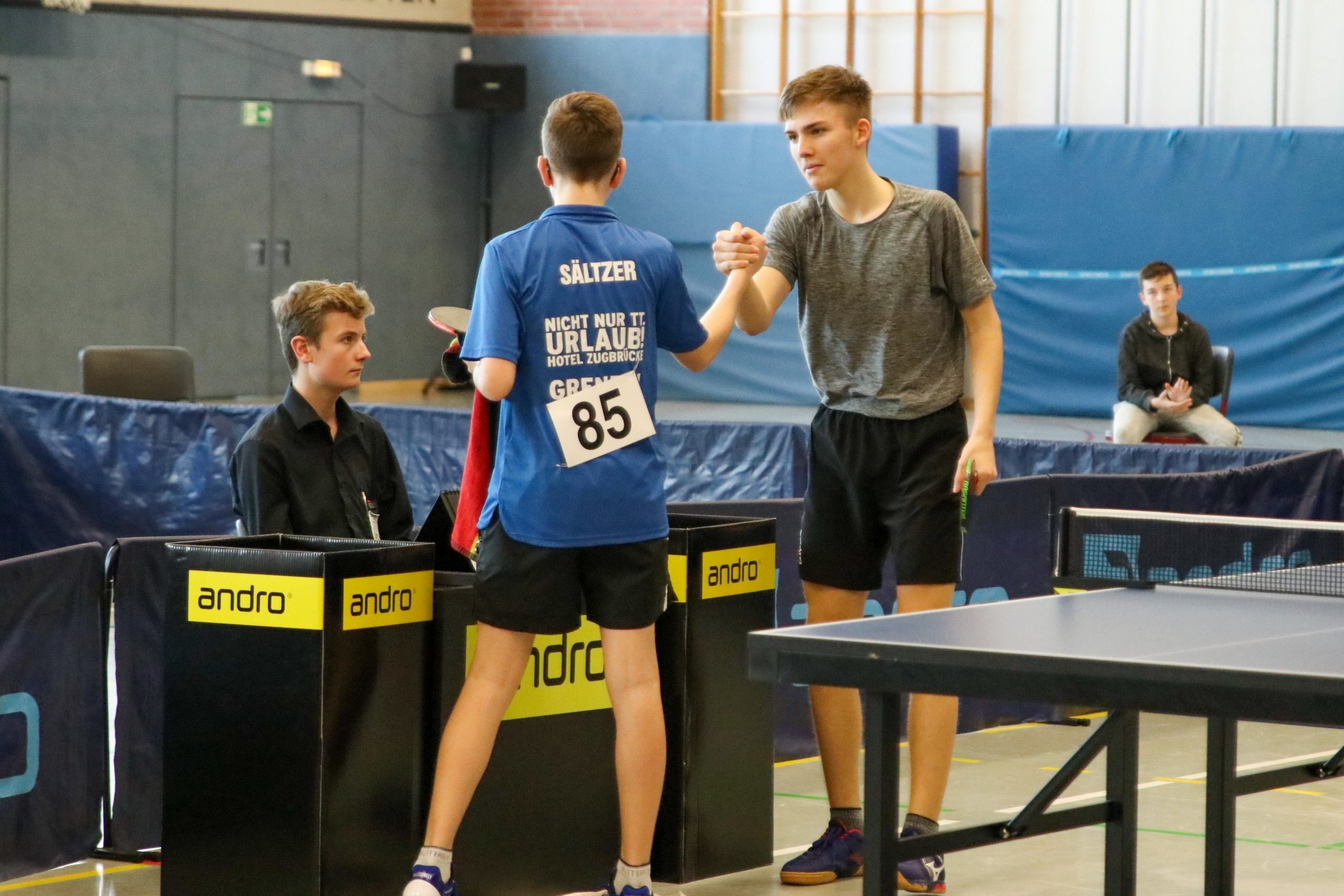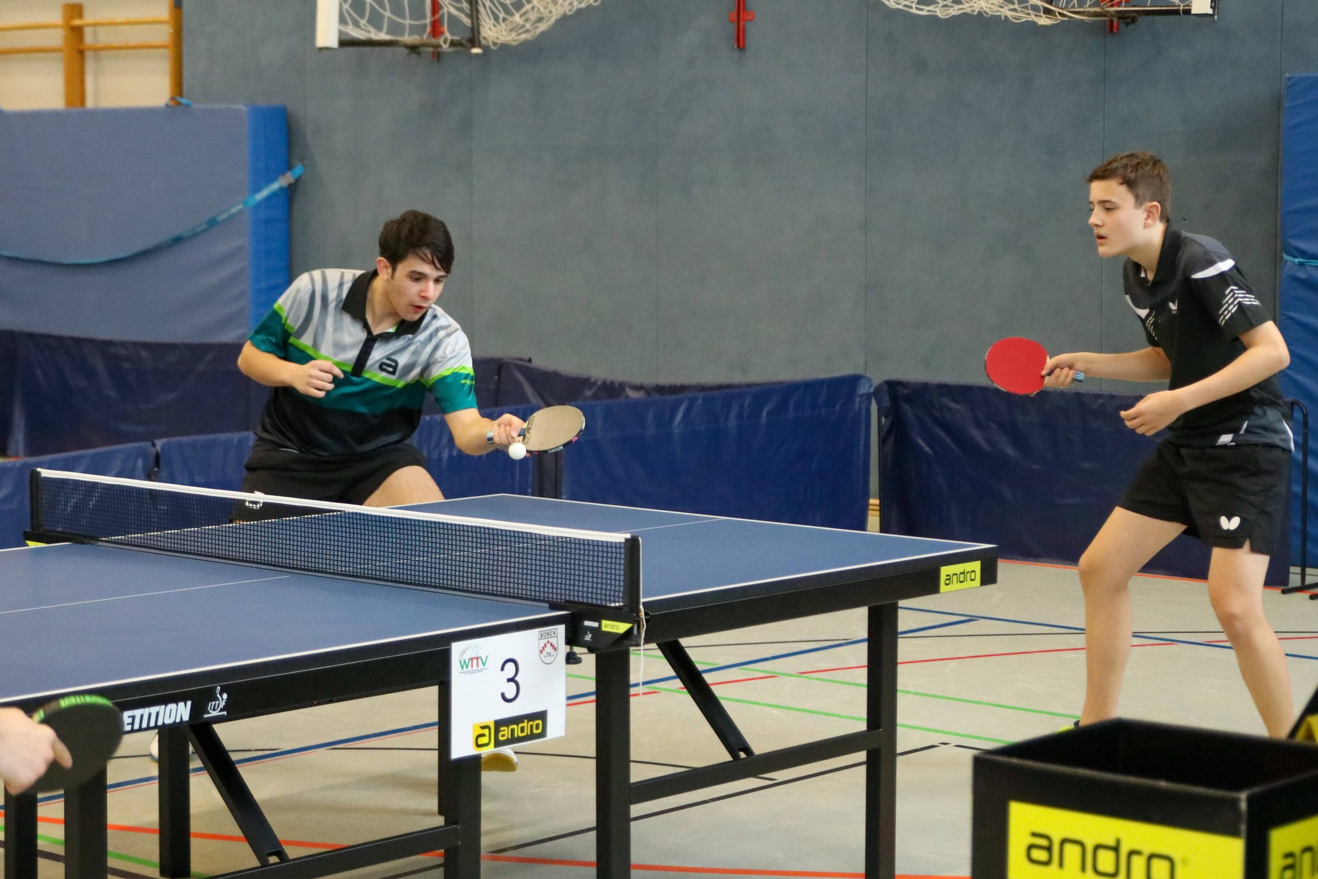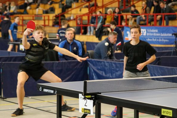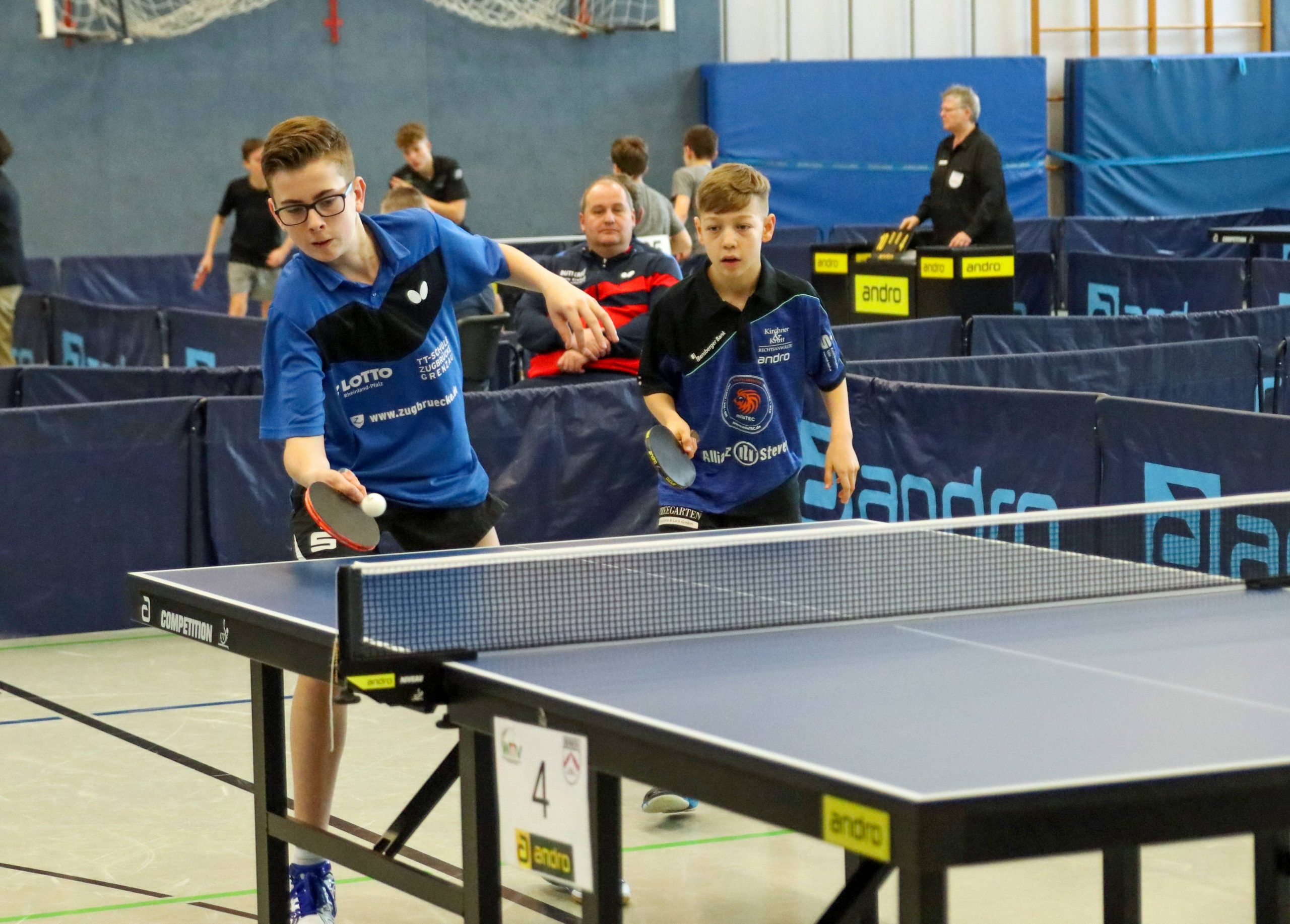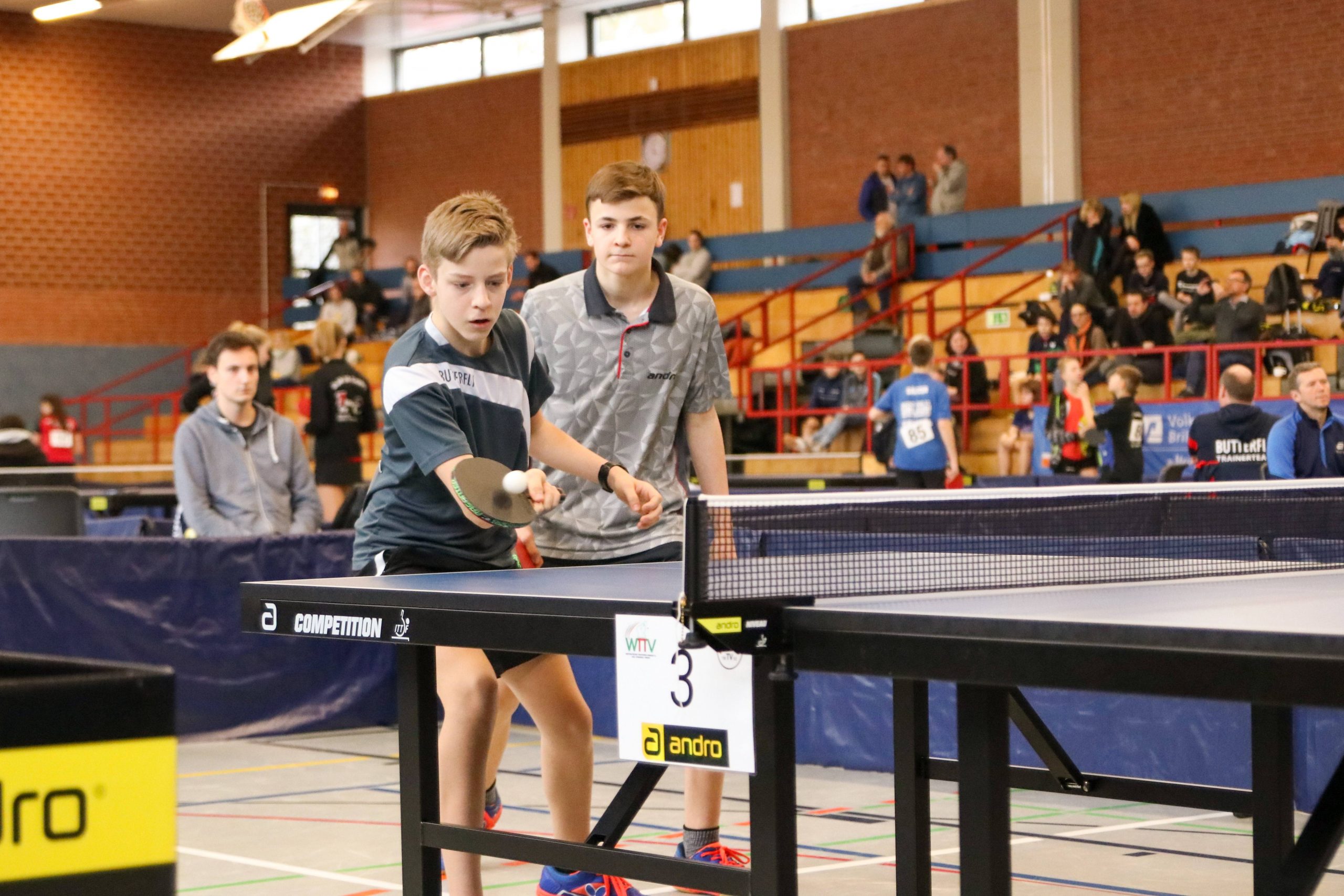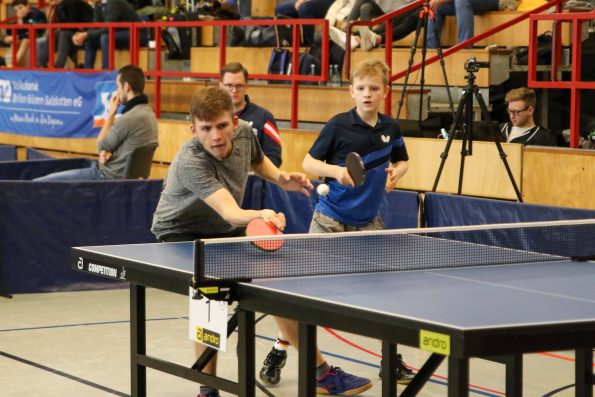 Bei den Jungen sah dieses wieder anders aus, hier trafen die an Position eins gesetzten Wim und Friedrich mit Jamal Oudriss und Tobias Sältzer (TV Refrath) auf die Zweiten der Setzliste. In einem ausgeglichenen Spiel musste hier der fünfte Satz die Entscheidung bringen, indem sich Wim und Friedrich etwas absetzen und am Ende deutlich mit 11:5 gewannen.