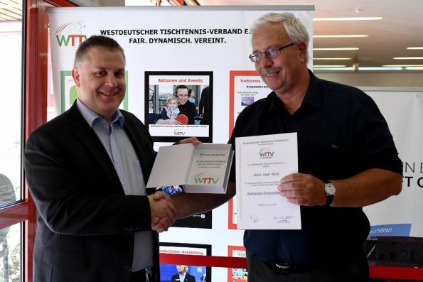 Im Rahmen der Deutschen Mannschaftsmeisterschaften der Schüler und Schülerinnen am 23.06.2018 in Essen wurde Heinz Josef Wüst mit der Ehrenplakette des Westdeutschen Tischtennis Verbandes geehrt. Der Vizepräsident des WTTV und auch Stellvertretende Vorsitzende des Kreises Euskirchen Erwin Daniel überreichte ihm seine Auszeichnung.
