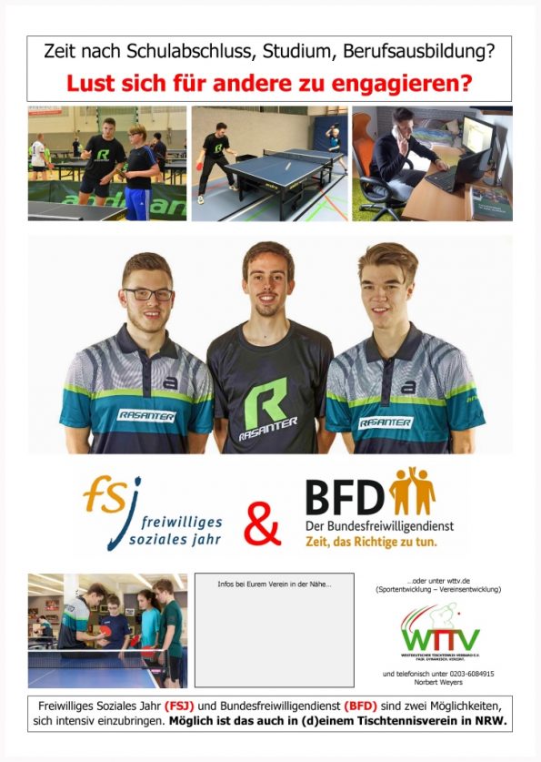 Ein FSJ/BFD kann auch in einem Tischtennisverein absolviert werde. Dazu muss sich der Verein als „Einsatzstelle“ registrieren lassen und kann dann einen FSJler/BFDler, meist für 10 Monate vom 1. August oder 1. September an einstellen.