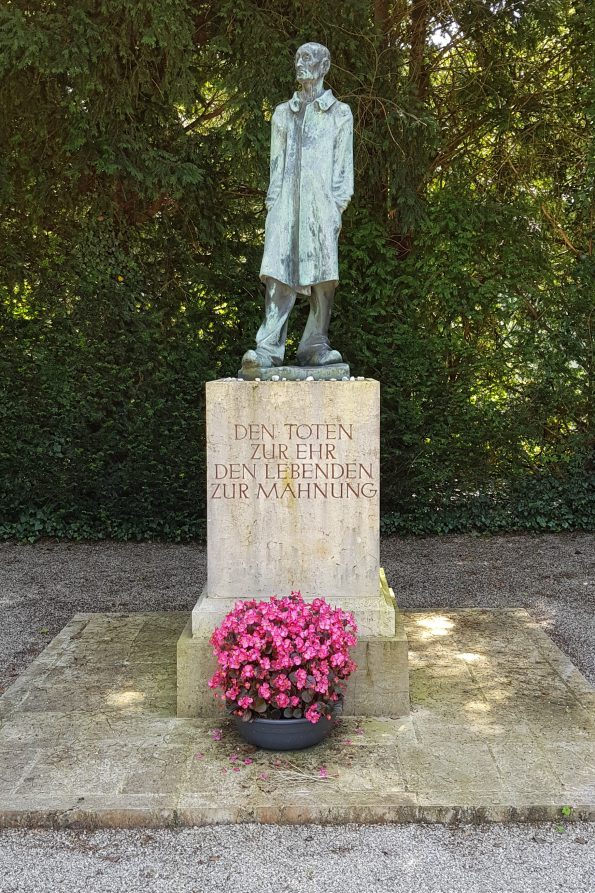 Denkmal am ehemaligen Krematorium in der Gedenkstätte Dachau. „Der unbekannte Häftling“ mit der Aufschrift „Den Toten zur Ehr. Den Lebenden zur Mahnung“.
