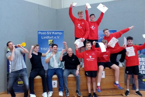 Bei den Jungen entschied sich die Meisterschaft für Gievenbeck wie erwartet im Spiel gegen Borussia Düsseldorf. Beide Teams gewannen ihre Partien gegen die TTF Bönen und den 1.FC Köln deutlich, so dass es im dritten Gruppenspiel um den Gesamtsieg ging. Hier erwischte Borussia Düsseldorf  den besseren Start. Das Doppel Guo/Schaprio konnte gegen Bosbach/Artarov gewinnen und beide Einzel im oberen Paarkreuz, Guo gegen Artarov und Schapiro gegen Bosbach, gingen an die Borussia. Lediglich das Doppel Rohrsen/Viktora mussten Ebbers/Ripploh gratulieren. Damit stand es 3:1 für Düsseldorf. Die nächsten beiden Spiele waren für den Titelverteigiger aus Gievenbeck damit enorm wichtig und beide Spiele waren vor Spannung kaum zu überbieten. Sowohl Linus Ripploh gegen Younes Gürsching, als auch Lukas Ebbers gegen Louis Rohrsen mussten in den Entscheidungssatz. Hier behielten beide Jungs aus Münster die Nerven und siegten mit 11:8 bzw. 12:10 und konnten damit den Ausgleich für ihr Team erreichen.