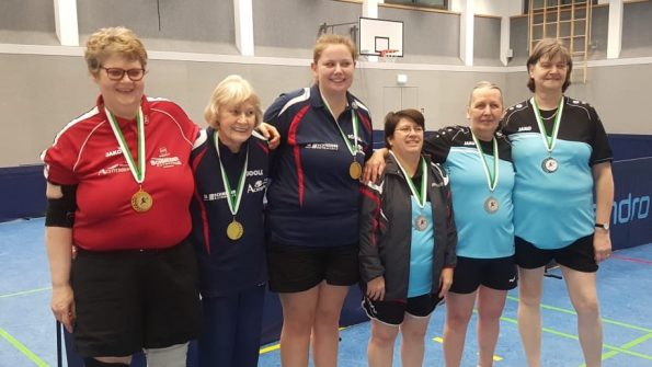 v.l.: Pokalsieger TTV Lübbecke mit Susanne Quade, Martha Willke und Caroline Alt – Vize-Pokalsieger TTV Lage II mit Manuela Madeira, Ulrike Heuer und Sabine Weber – Foto: Caroline Alt
