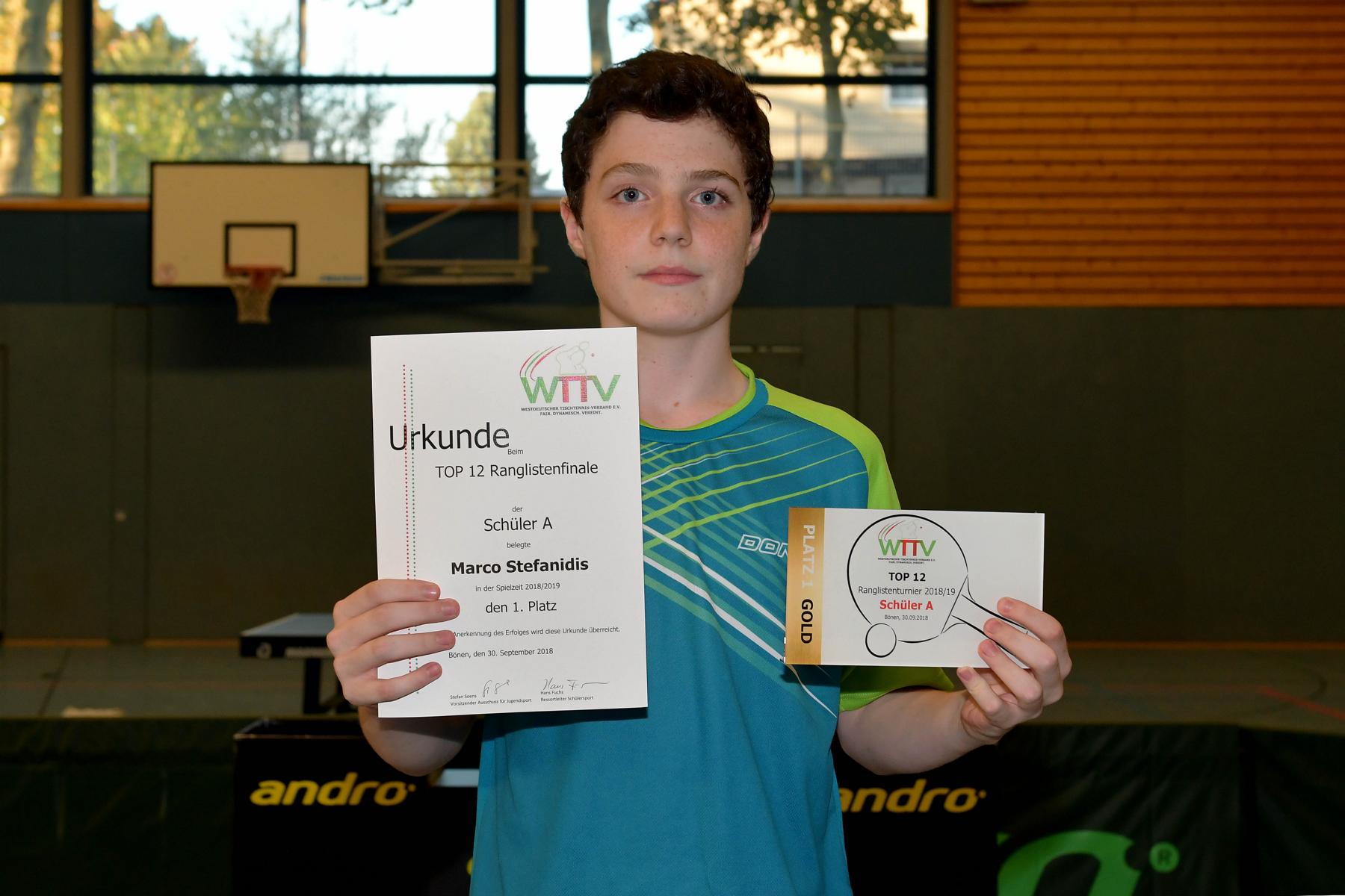 Die Tischtennisfreunde aus Bönen waren Gastgeber der WTTV Ranglistenturniere TOP 12/10 der Schüler/Innen A bei denen sich die Favoriten durchsetzen konnten. In den Gruppenspielen der Schüler zeigte besonders Marco Stefanidis (Heilingenhauser SV) mit einer Bilanz von 5:0, dass er zu den Favoriten gehört. Hinter Marco landeten Pascal Hong (Borussia Düsseldorf) und An Duy Dang (TTC Lövenich), Luc Lange (DJK BW Avenwedde), Tyson Tan Hasse (TTF Bönen) und Michael Kalaitzidis (Borussia Düsseldorf) auf den Plätzen zwei bis sechs.