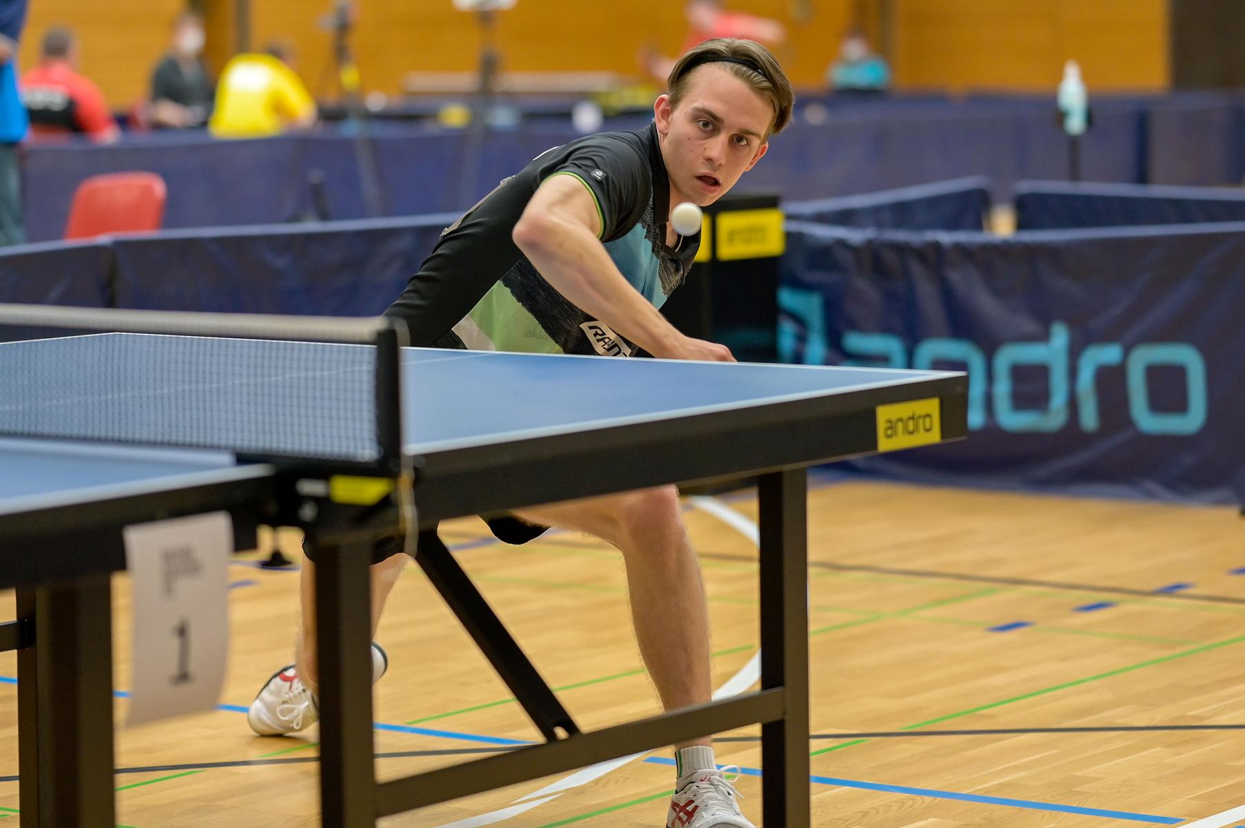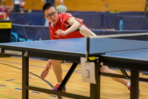 Diese Halbfinalspiele setzten sich aus den Paarungen Andre Bertelsmeier gegen Wim Verdonschot und Tobias Slanina gegen Jiaxing Guo zusammen. Und wer diese Spiele gesehen hat, merkte schnell, dass hier ganz großes Tischtennis geboten wurde. Tobias und Jiaxing schenkten sich nichts. Tobias führte bereits mit 2:0 in den Sätzen, bevor Jiaxing wieder einmal zeigte, dass er keinen Ball verloren gibt und die Sätze drei und vier gewinnen konnte. Der Entscheidungssatz war mit hervorragenden Ballwechseln gespickt. Hauchdünn und stets fair ging es zu und zum Schluss setzte sich Tobias mit 11:9 durch und zog ins Finale ein.