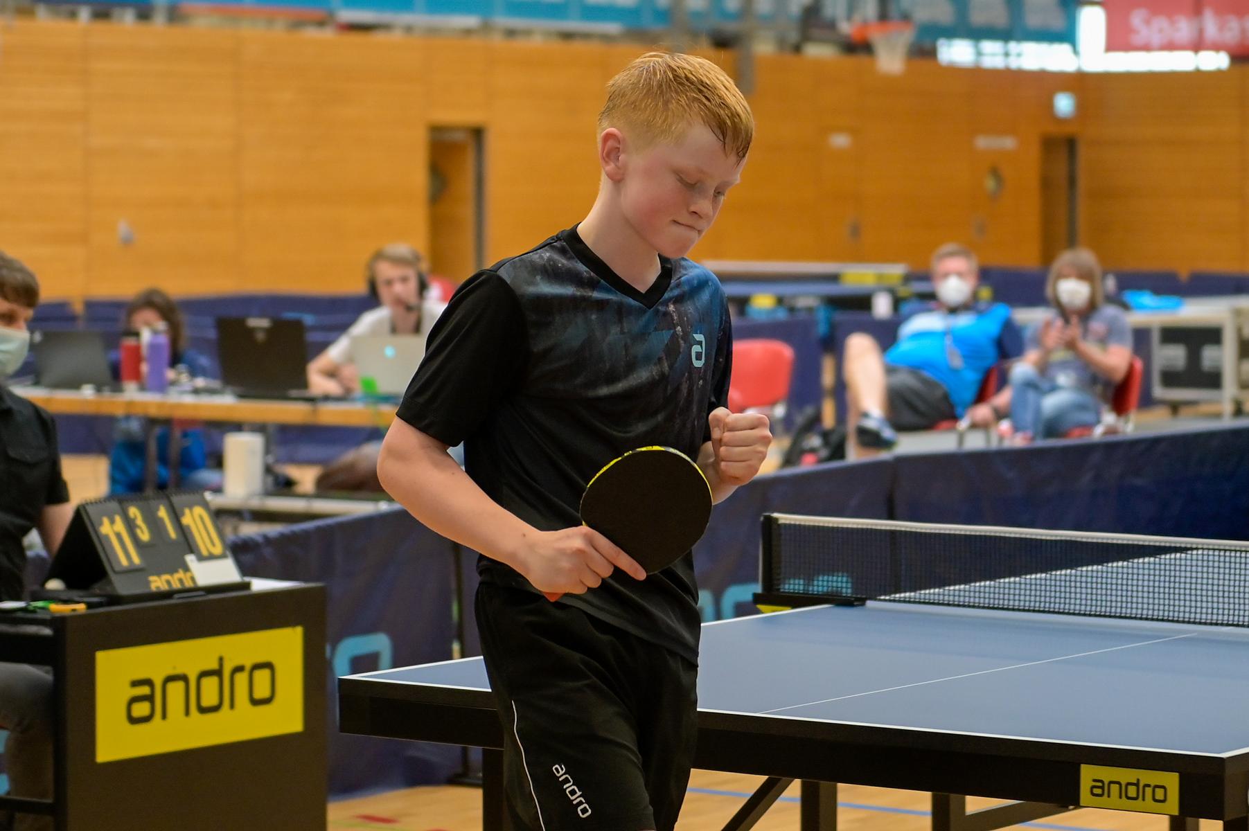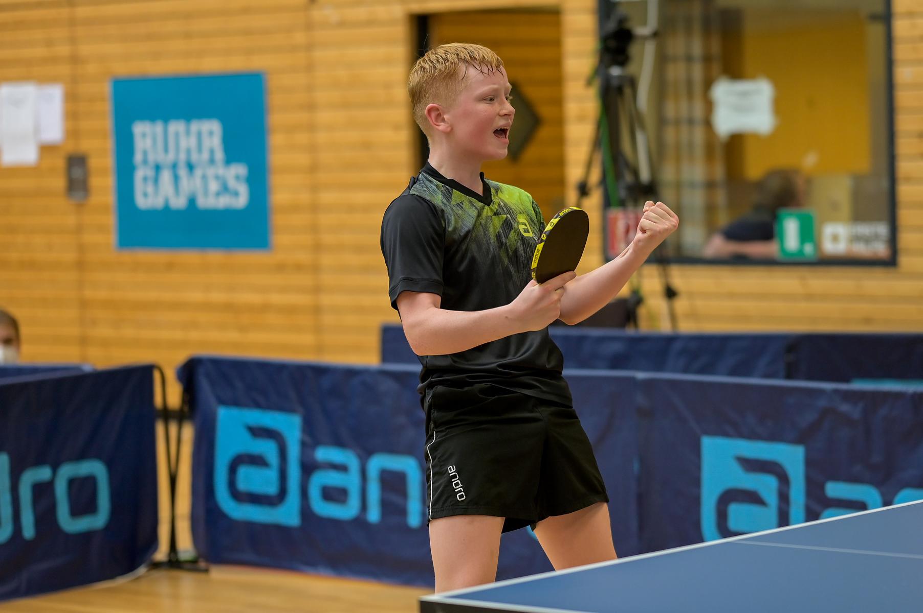 Im Endspiel der Jungen staunten die Anwesenden über die Leistung der Finalisten. Andre Bertelsmeier (TTC GW Bad Hamm) und Tobias Slanina (TTC Altena) gaben keinen Ball verloren. So ging es hin und her und es wurde das erwartete enge Spiel. Zum Schluss gewann Andre mit 11:9, 7:11, 11:8, 11:9, 12:10 und freute sich sehr über den Sieg.
