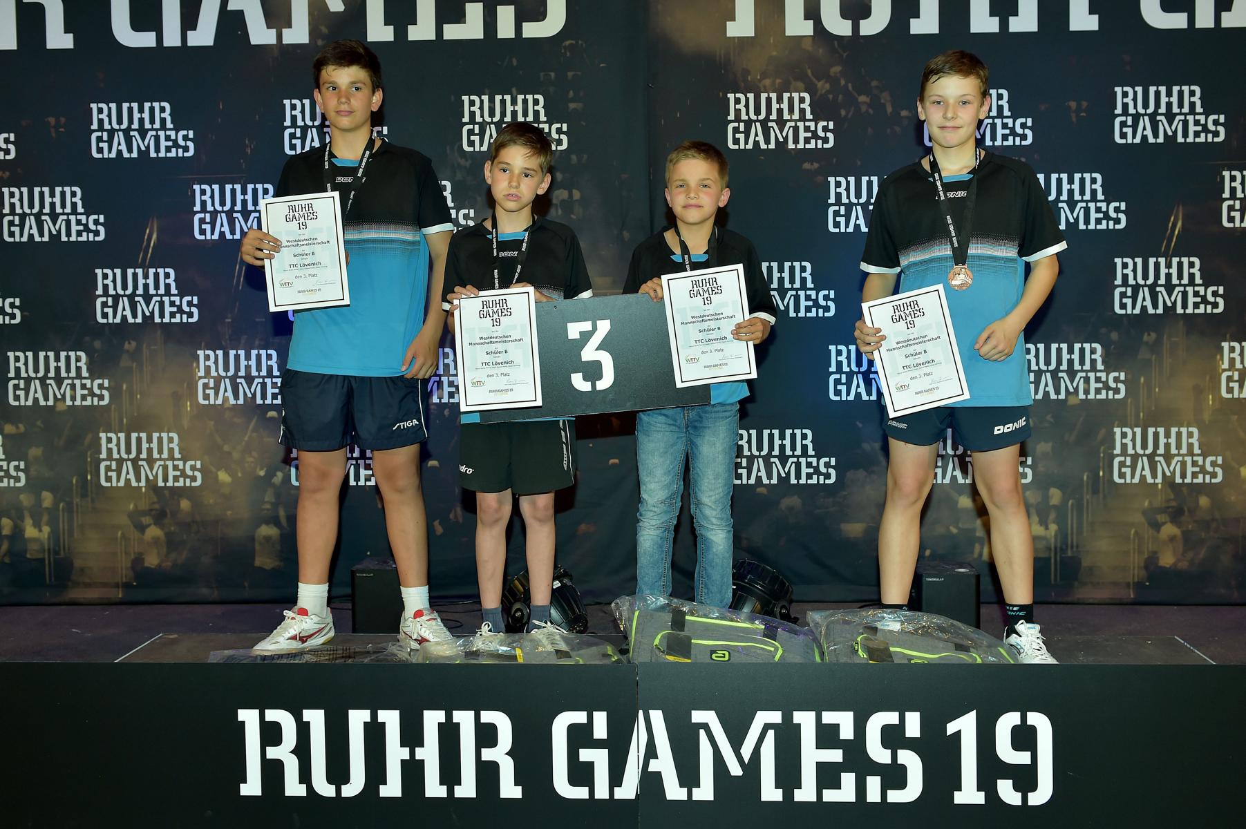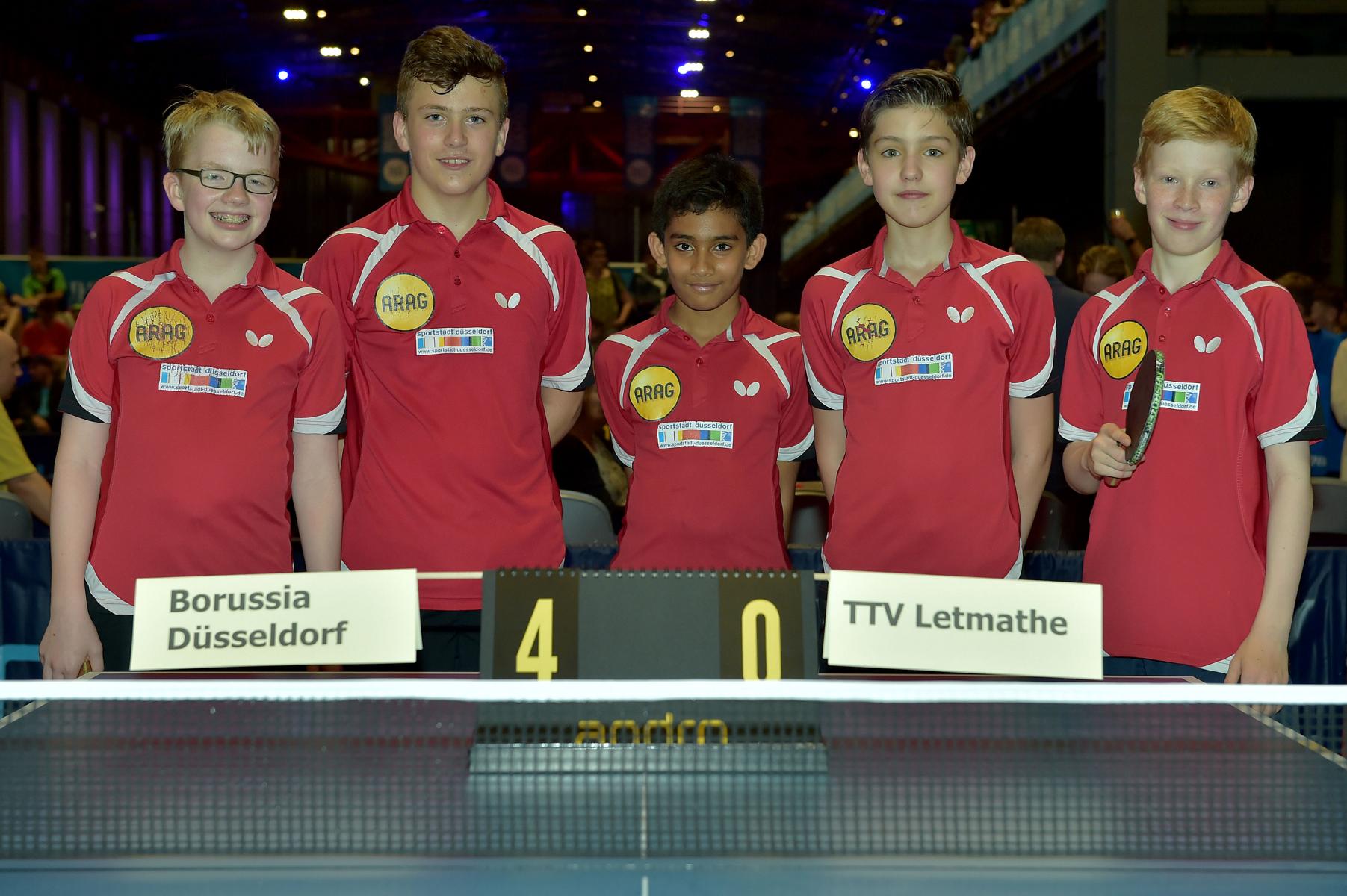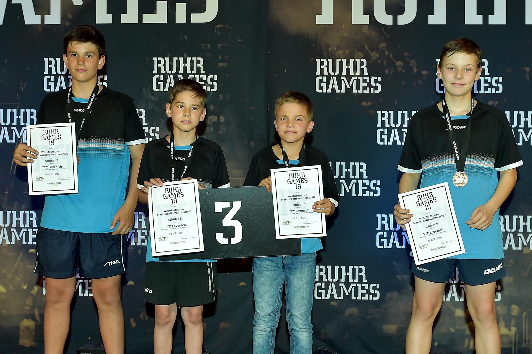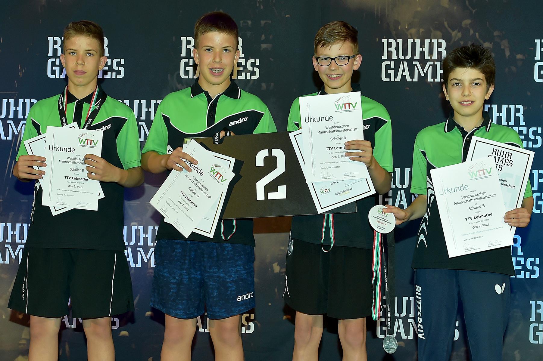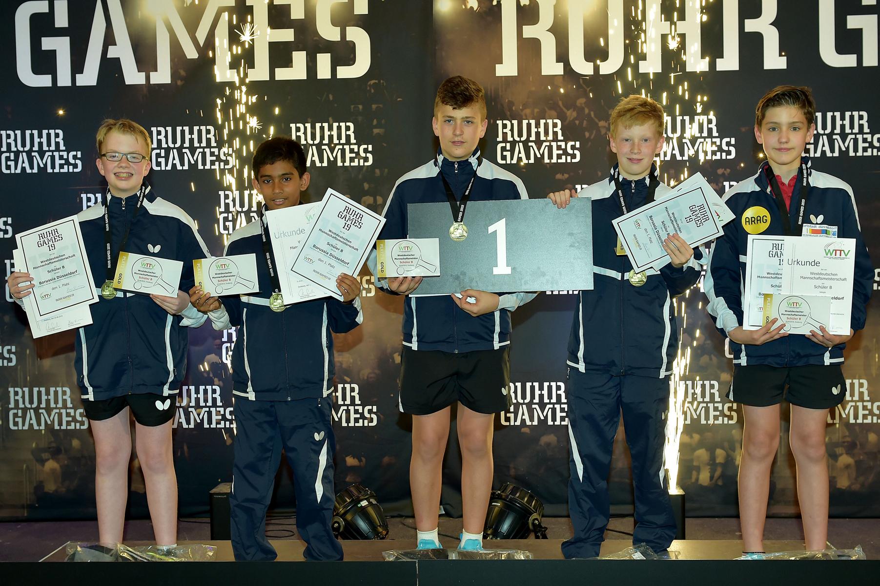 Bei den Schülern B wurde Borussia Düsseldorf mit Rian Patra, Emilo Schulz und Emil Schreiber der Favoritenrolle gerecht. Im Finale ließen die Borussen dem TTV Letmathe (Arda Yenen, Sebastian Koch und Simon Benz) beim 4:0 Kantersieg nur einen einzigen Satzgewinn zu.