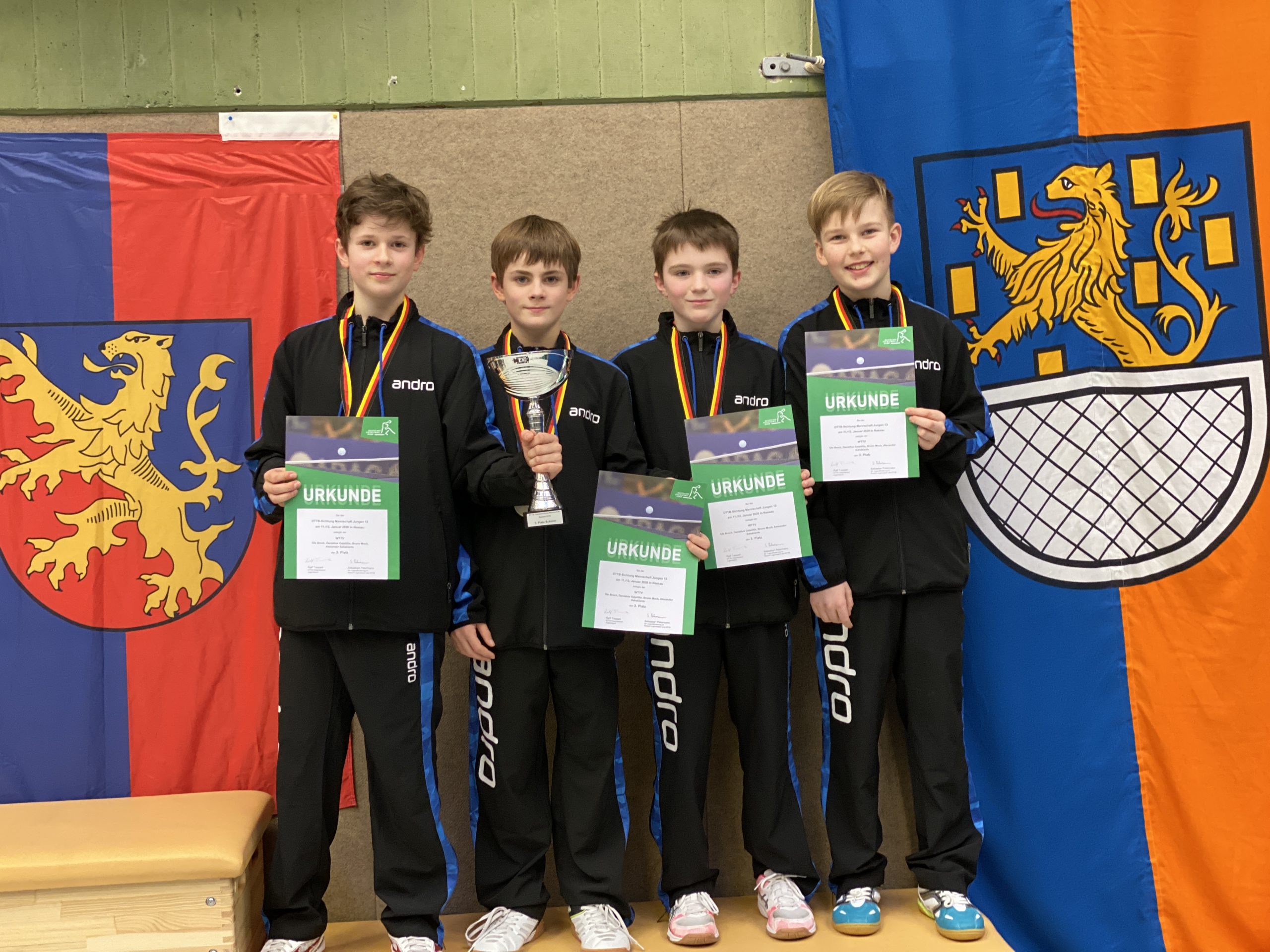 Die Jungen spielten eine tolle Vorrunde und konnten sich drei Siege gegen Thüringen (4:1), Niedersachsen (4:1) und Saarland (3:2) sichern. Somit konnte die Mannschaft mit Danielius Galatiltis (TTC Schwalbe Bergneustadt), Alexander Sahakiants (1. FC Köln), Ole Brock (LTV Lippstadt) und Bruno Moch (TTC Lövenich) in der Zwischenrunde pausieren und sich der Analyse des nächsten Gegners widmen. Hier warteten dann im Viertelfinale die Bayern, die nach jeweils zwei Siegen von Danielius und Alexander und einer Niederlage von Bruno, mit 4:1 bezwungen wurden. Am Sonntag war das hessische Team im Halbfinale ein erwartet schwerer Gegner. Alexander und Danielius mussten sich jeweils gegen die hessische Nummer eins, Tom Wienke, knapp geschlagen geben und Bruno verlor gegen Cedric Montimurro. Dementsprechend wurde das Spiel mit 2:3 verloren. Im Spiel um Platz drei gegen Niedersachsen konnten dann Danielius und Alexander wieder jeweils zweimal punkten und die Mannschaft konnte sich über einen Podestplatz und eine Bronzemedaille freuen. „Die Jungs haben eine super Veranstaltung gespielt. Alexander hat während der Veranstaltung nur ein Einzel verloren. Danielius musste nur zwei Gegnern gratulieren. Auch Ole und Bruno haben zu der Medaille beigetragen.“- so Verbandstrainerin Christine Mettner.