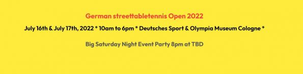 Vom 16.7.-17.7.2022 finden die GERMAN STREETTABLETENNIS OPEN 2022 in Köln statt! Die Organisatoren von Streettabletennis haben hierfür 128 Starterplätze eingerichtet. Das Event wird auf dem Dach des Deutschen Sport & Olympia Museums ausgetragen. Durch die Festivalatmosphäre verspricht diese Veranstaltung ein Jahreshighlight im Straßensport zu werden! Die ersten internationalen Anmeldungen liegen bereits vor! Tickets und mehr Infos über das Turnier erhaltet ihr hier: streettabletennis – celebrating the sport (germanstreettabletennisopen.com)
