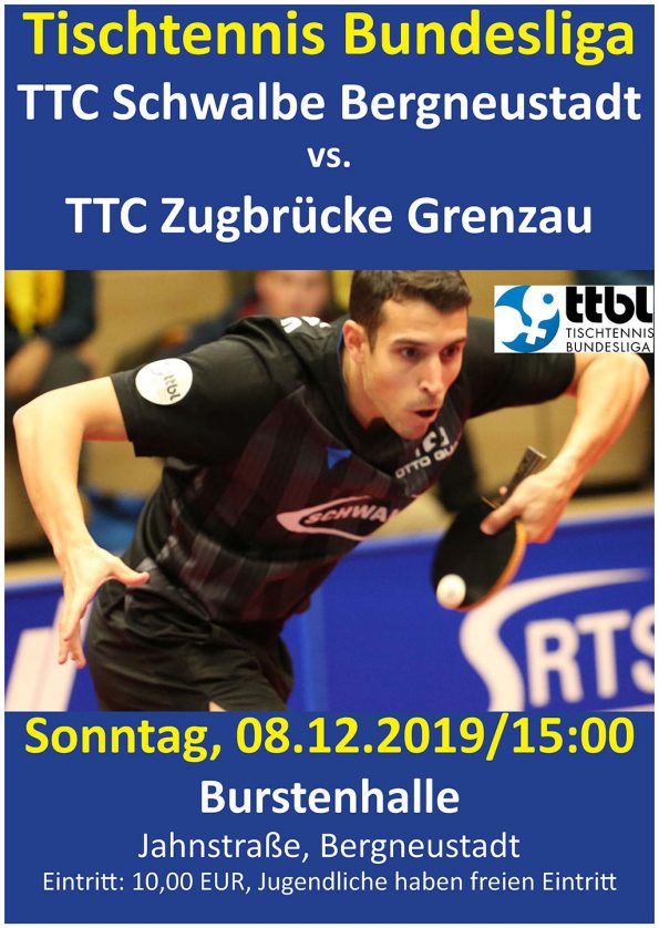 Zum ersten Heimspiel der Rückrunde, am zweiten Advent, Sonntag, den 08.12.19 um 15:00 Uhr, empfängt der TTC Schwalbe Bergneustadt den Westerwälder Verein TTC Zugbrücke Grenzau in der Burstenhalle. Bei den Gästen ist an Position Eins das 19-jährige US-amerikanische Ausnahmetalent Jha Kanak Jha gemeldet. Der dänische Meister Anders Lind wird an Postion zwei auflaufen. Der Grieche Ioannis Sgouropoulos war Europameister in der U18-Klasse. Mit dem Italiener Mihai Bobocica steht in den Reihen der Brexbachtaler auch ein erfahrener Spieler im Team.