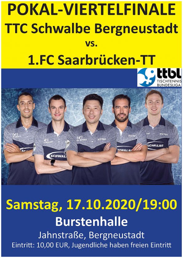 Am Samstag, den 17.10.20 ab 19:00 Uhr kommt es in der Burstenhalle zum Showdown. Der Deutsche Meister wird mit seinen Spitzenspielern Patrick Franziska aus Deutschland, Shang Kun aus China und Darko Jorgic aus Slowenien auflaufen. Das Team des TTC Schwalbe Bergneustadt wird versuchen, das Pokalmatch so lange wie möglich offen zu halten. Mit Unterstützung unserer treuen Fans werden wir versuchen, das Unmögliche möglich zu machen. Schaut bitte in der Burstenhalle vorbei!