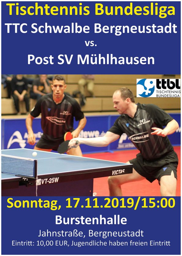 am Sonntag, den 17.11.19 um 15:00 Uhr empfängt der TTC Schwalbe Bergneustadt den Champions League Teilnehmer Post SV Mühlhausen zum letzten Heimspiel der Hinrunde 2019. Die Gäste aus Thüringen werden von dem Österreicher Daniel Habesohn angeführt. An Position Zwei läuft der Ex-Bergneustädter Steffen Mengel ein, gefolgt vom Lubomir Jancarik. Auch der Rumäne Ovidiu Ionescu, mit dem Alvaro Robles im April 2019 Doppel-Vizeweltmeister wurde, ist in der Burstenhalle zu bewundern.