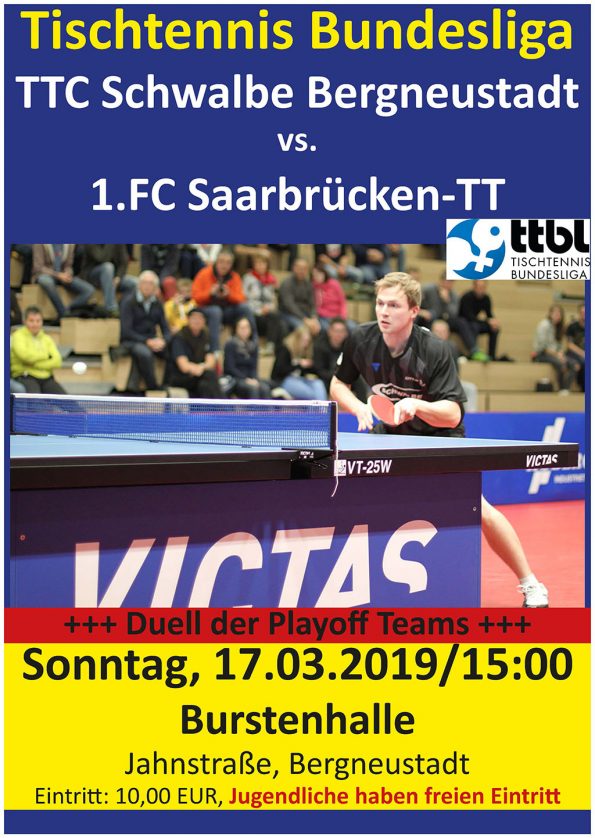 Am Sonntag, den 17.März 2019 um 15:00 Uhr empfängt TTC Schwalbe Bergneustadt in der Bergneustädter Burstenhalle den Tabellennachbar 1.FC Saarbrücken-TT. Wie der TTC Schwalbe Bergneustadt gehören die Saarländer zu den Top Vier Teams der Bundesliga, die sich die Teilnahme an den Playoff-Spielen um die Deutsche Meisterschaft gesichert haben. Die Gäste aus Saarbrücken werden mit dem Deutschen Vizemeister 2019 im Einzel und der Nummer 16 der Weltrangliste Patrick Franziska auflaufen. Mit unseren Spielern Alvaro Robles, Paul Drinkhall, Benedikt Duda und Vladimir Sidorenko werden wir alles daran setzen, die zwei Punkte in Bergneustadt zu behalten. Wir würden uns freuen, wenn Sie uns bei diesem Heimspiel unterstützen würden.