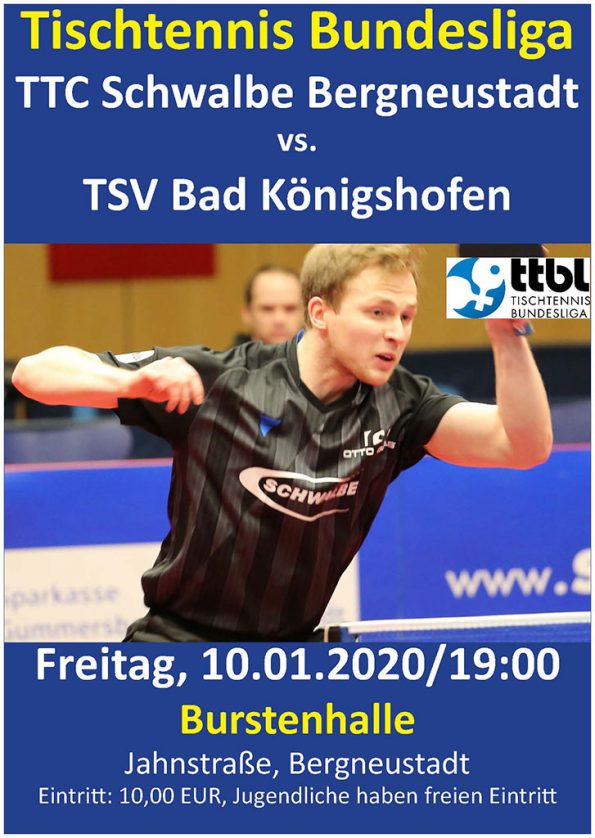 Nach der kurzen Weihnachtspause geht es in der Tischtennis-Bundesliga Schlag auf Schlag weiter. Am Freitag, den 10.01.20 um 19:00 Uhr empfängt TTC Schwalbe Bergneustadt das Team des TSV Bad Königshofen, das von der deutschen Tischtennis-Legende Bastian Steger angeführt wird. Mit dem japanischen Spitzenspieler Mizuki Oikawa und dem deutschen Nachwuchstalent Kilian Ort haben die Unterfranken zwei junge Ausnahmespieler in ihrem Kader. Im Hinspiel gab es für die Schwalben eine 1:3-Schlappe. TTC Schwalbe Bergneustadt möchte alles daran setzen, die Hinspiel-Niederlage wettzumachen. Für dieses Vorhaben brauchen wir Ihre Unterstützung, Sie das beste Publikum der Liga. Wir laden Sie herzlich ein, unser Team in diesem Spitzenspiel in der Burstenhalle zu unterstützen.