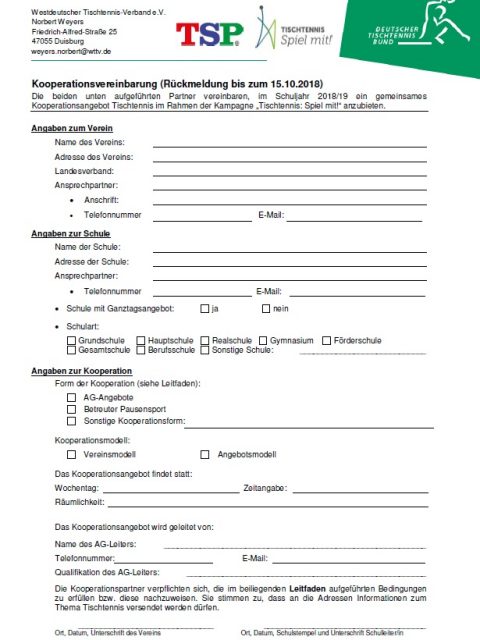 Die Umsetzung einer Kooperation erfolgt beispielsweise über eine Tischtennis-AG, die ein Übungsleiter des Vereines leitet und die Kinder so für eigene Vereinsaktivitäten (mini-Meisterschaften, Schnuppertraining etc.) begeistern kann. Aber auch kleinere Angebote wie z.B. ein betreuter Pausensport sind durchaus möglich. Sollte Ihr Verein Interesse an der Kampagne „Tischtennis: Spiel mit!“ haben, sollte er das Gespräch mit der Schule suchen. Die Schulen sind dankbar, wenn Vereine sich beispielsweise in der Nachmittagsbetreuung sinnvoll einsetzen möchten. Sofern die Rahmenbedingungen mit der Schule geklärt sind, sollten beide Kooperationspartner die jeweilige Kooperationsvereinbarung des Landesverbandes ausfüllen und diese an den jeweiligen Ansprechpartner bzw. an dem DTTB übermitteln, um so von den zahlreichen Vorteilen zu profitieren.