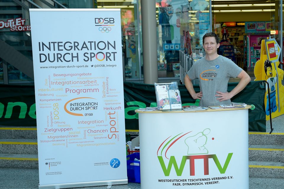 Unterdes informierte der WTTV die Besucher im Einkaufszentrum „Neue Mitte“ über unseren Sport. Neben Spielmöglichkeiten an kleinen und großen Tischen und einem Ballroboter gab es Antworten auf Fragen zum Programm „Integration durch Sport“