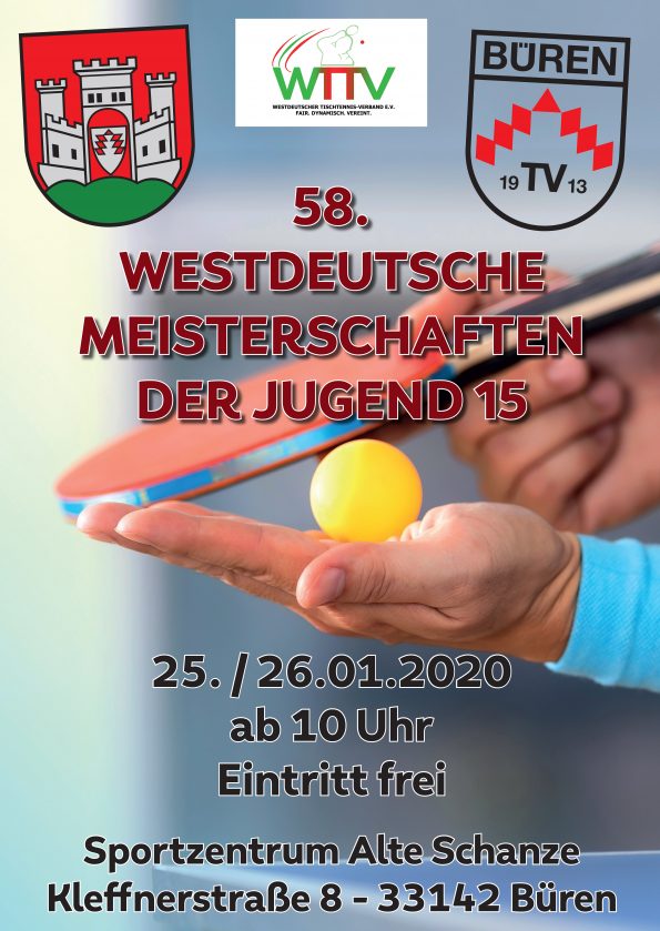 Nach den Damen und Herren ist nun für die Jugend 15 die Bühne geebnet. Am 25./26.01. schlagen 48 Mädchen und Jungen beim TV Büren auf, um den Westdeutschen Einzel- und Doppelmeister zu ermitteln. Los geht es am Samstag um 10 Uhr im Sportzentrum Alte Schanze, Kleffnerstraße 8 in 33142 Büren.