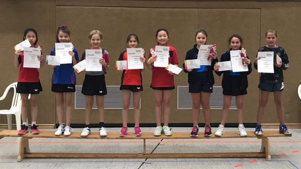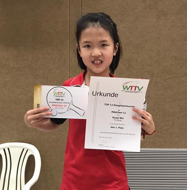 Bei den Mädchen setzte sich Ruoqi Wei (TG Neuss), die auch zu den Favoritinnen gehörte, souverän durch. Während der gesamten Veranstaltung konnte sie alle Spiele für sich entscheiden und gab nur wenige Sätze ab. Mitfavoritin Rhea Chen (Borussia Düsseldorf) konnte leider nicht spielen, da ihr Schläger vor dem ersten Gruppenspiel durch die Kontrolle fiel. Maria Holin (TTK Anröchte) spielte eine tolle Veranstaltung und konnte sich mit einer 6:1-Bilanz den zweiten Platz erspielen. Auf dem dritten Platz landete Frieda Strugholz (TV Geseke), die sich lediglich gegen Wei und Holin knapp geschlagen geben musste.