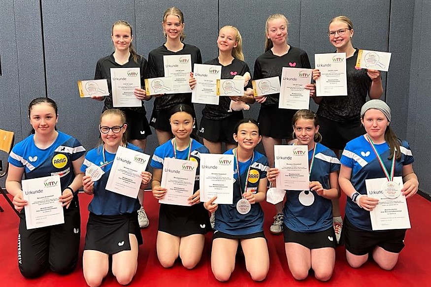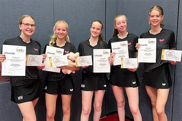 Sonntag spielte dann die U18-Konkurrenz ihren Meister aus. Bei den Mädchen starteten die DJK SR Cappel, Borussia Düsseldorf, SV DJK Holzbüttgen und TTC Wuppertal. Nachdem die Teams aus Cappel und Düsseldorf ihre beiden vorherigen Spiele gewinnen konnten, kam es in der letzten Partie dann zum Endspiel um den Titel. In diesem konnten sich die Mädchen aus Cappel beim Stand von 2:2 durch die Siege von Jana Schultza und Michelle Wulff entscheidend zum 4:2 absetzen. Diesen Vorsprung retteten sie dann bis ins Ziel und holten sich mit der Unterstützung von Medeea Grozav-Marcu und Angelina Wulff den Titel.