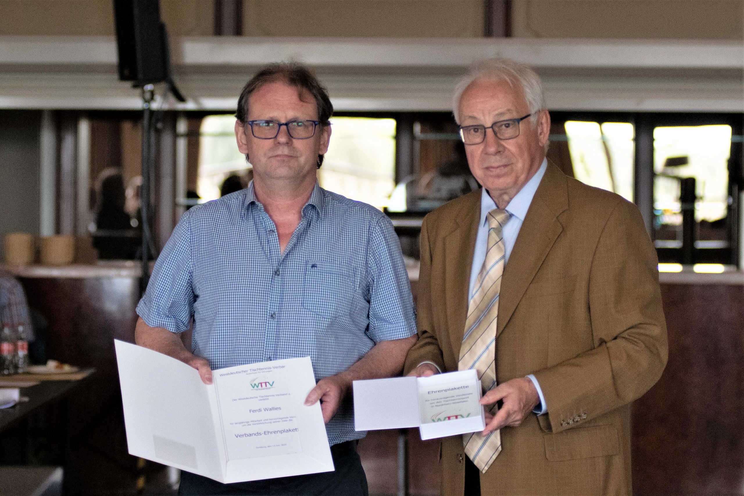 Eine zweifache Ehrung stand danach auf dem Programm: Für seine Verdienste wurde Ferdi Wallies (Stolberg) nicht nur mit der Ehrenplakette des WTTV ausgezeichnet, denn DTTB-Präsident Michael Geiger verlieh dem Vorsitzenden des Bezirkes Mittelrhein im Anschluss zusätzlich die Ehrennadel des DTTB in Bronze.