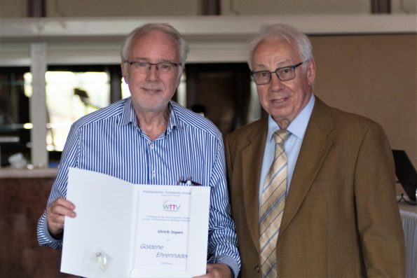 Ulrich Jopen, der seit 1993 als 1. Vorsitzender des 1. TTC Hardt-Venn die Belange seines Vereins führt, von 1999 bis 2009 den Vorsitz des Spruchausschusses im Bezirk Düsseldorf inne hatte, bevor der Jurist dann ab 2009 den neu eingeführten WTTV-Kontrollausschuss als Vorsitzender übernahm, erhielt als Dank für sein großes Engagement die Goldene Ehrennadel des Verbandes verliehen. Der 75-jährige Mönchengladbacher, dessen juristischer Rat seitens des WTTV immer sehr geschätzt wurde und auch in Zukunft gefragt sein wird, stellte sich nach nun 12 Jahren Verbandsarbeit nicht mehr zur Wiederwahl.